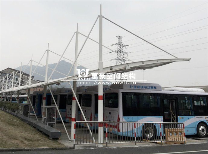 膜結構雨棚施工面積約5138平方;用鋼量約80噸。施工難點在于工期緊。施工時天氣情況差,連續的陰雨天給鋼構的油漆施工帶來了極大的麻煩并且延誤了工期。雨棚底下還要安裝充電樁,我們還要和充電樁施工班組進行技術對接,規劃充電樁的安裝位置。由于工期緊,天氣狀況差,我們動用了兩個施工班組加班加點,土建、鋼構交叉施工,最后如期完工。由于每個雨棚長度比較長,施工班組在立好鋼構件之后從中間開始往兩邊安裝膜布,使工作效率有了很大的提高。