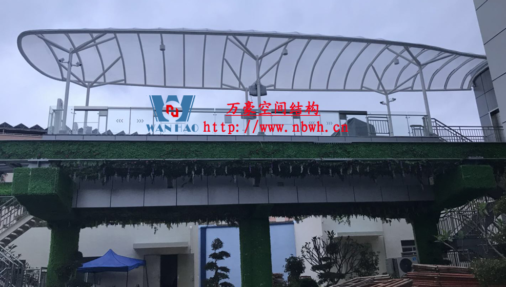云巴園區(qū)試驗(yàn)示范線膜結(jié)構(gòu)工程-四角站(原名:坪山一期生產(chǎn)園區(qū)C型線云軌站)位于深圳市坪山區(qū)比亞迪路3009號(hào)比亞迪股份有限公司園區(qū)四角大廈西面,該工程用鋼量50噸,膜材展開面積2000平方米,遮蓋材質(zhì)選用最為優(yōu)質(zhì)的ETFE膜材(日本旭硝子),鋼構(gòu)則選用了起拱和各種大小圓弧相融合。