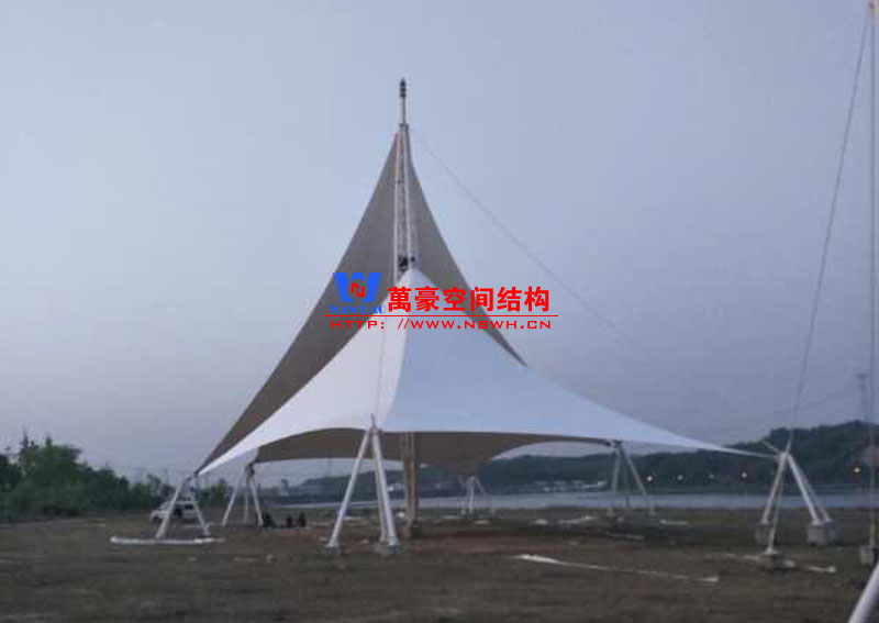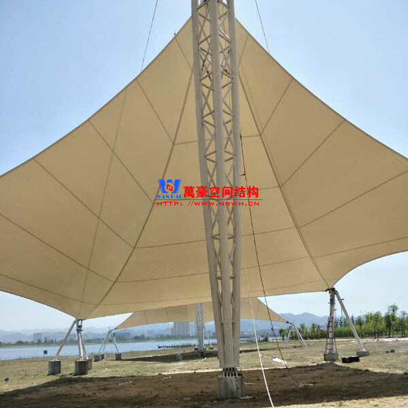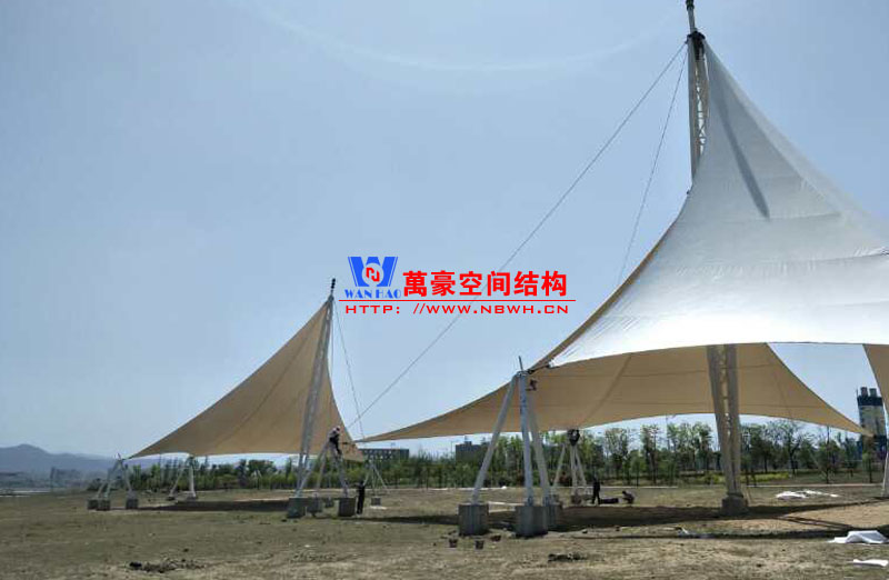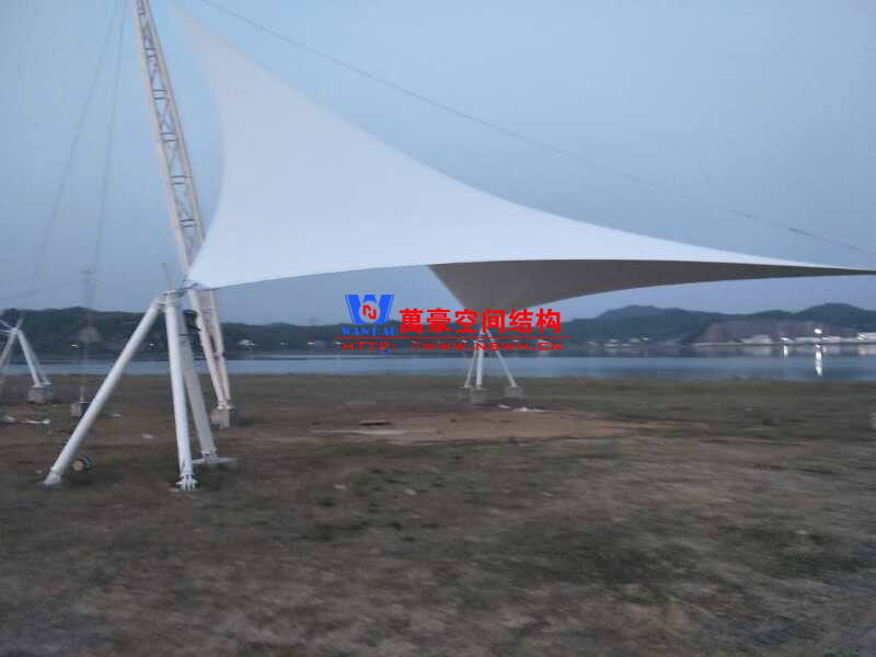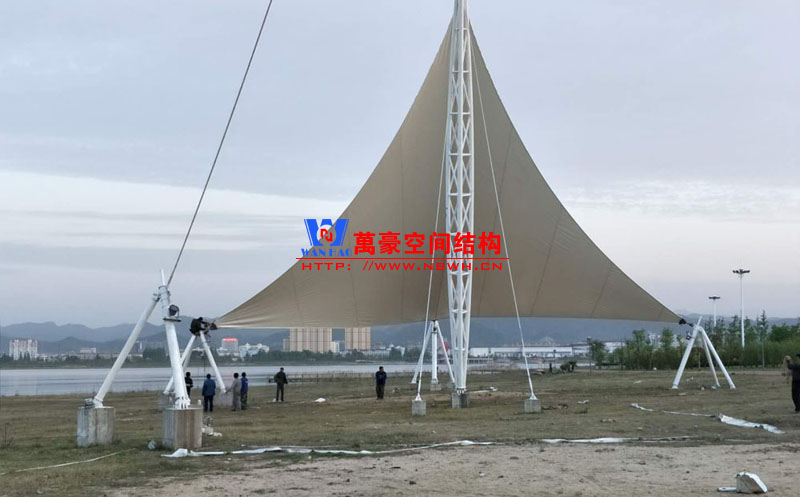 雙飛燕景觀膜結構工程總建筑面積約為860平方米,總用鋼量約為27.69噸。桁架、鋼管材質均為Q235B鋼,相貫焊接。安全等級為二級,膜材選用意大利進口雙面PVDF超自潔涂層膜材,鋼結構設計使用年限20年。所有鋼構件熱鍍鋅處理,運輸、安裝過程中對涂層的損傷,須視損傷程度的不同釆取相應的修補方式,對拼裝焊接的部位必須清除焊渣,進行表面處理達到St3級要求后,涂刷環氧無機富鋅底漆+環氧云鐵中間漆+氟碳面漆。