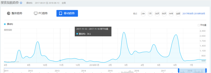 最后,就是中國膜結構網的熱度趨勢了。近些年來,膜結構行業在中國穩步提升,每年的旺季分別在3到6月份,以及8到10月份,所以想做膜結構的伙伴們可以選擇這個時段去做哦。