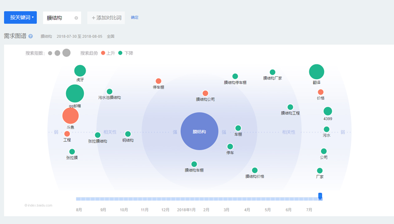 其次,從需求圖譜分析,我們可以發現中國膜結構網內呈上升趨勢的幾個詞,分別是膜結構公司、停車棚、工程、價格,這組數據代表著客戶做膜結構工程時著重關注的幾個要點。我們不難發現,當季熱門的膜結構建筑為車棚類工程,在選擇公司的同時,價格也是一個參考點,在這里,萬豪友情提醒大家一下,一分價錢一分貨,別一味追求廉價而忽略質量,找到性價比最高的才是最劃算的。