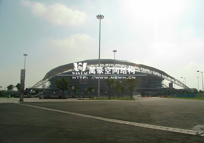 頂層膜結構分內外膜,外膜采用PTFE材料,水平投影面積約15000平方米,局部采用PVC內膜,覆蓋在比賽場地及觀眾席上方,工程整體結構造型美觀新穎,與周圍環境相融洽。為寧波市獨具景觀特色的標志性建筑。