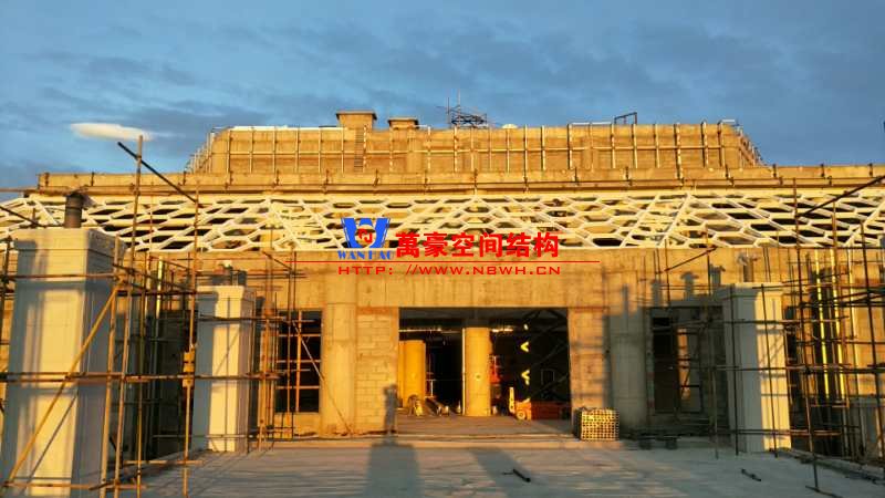 目前,觀光塔鋼膜結構項目架子已搭建完畢,接下來要做的是防護工作。綜合辦公樓鋼膜結構項目穹頂鋼構預計月底之前完成;斜屋面已做好三個面,其中兩個面已做完油漆,預計七月中旬斜屋面鋼構全部完成。