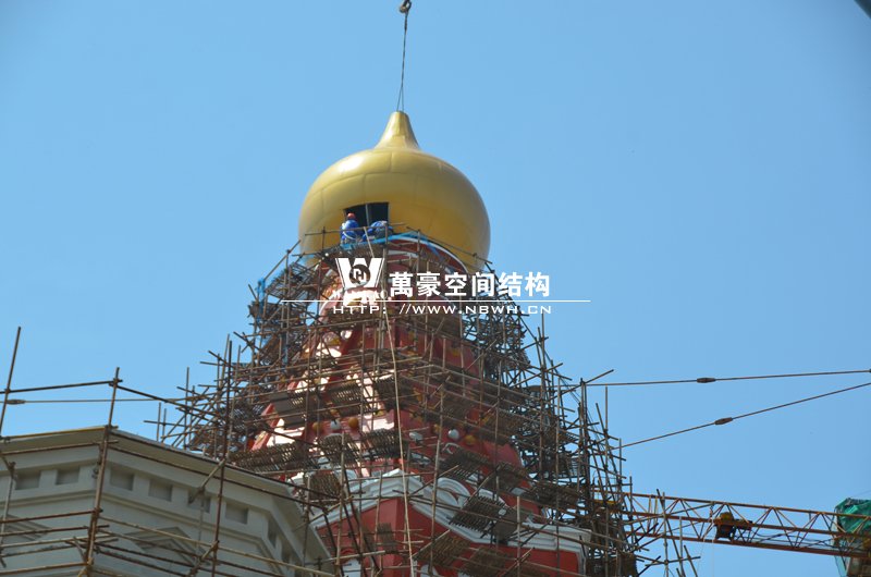 我司承建的橫店影視城圓明新園俄羅斯館已經(jīng)進(jìn)入頂部吊裝階段,本次吊裝難度極大,有著重、高、精等特點(diǎn)。本次吊裝的球體采用鋼結(jié)構(gòu)骨架加鋁合金外殼組成,自重很大,同時(shí)球體在吊裝過程不能變形,對(duì)球體前期的設(shè)計(jì)制作要求高,因其重量大,所以使用了大噸位吊車。本次吊裝高度高,很多都是高空作業(yè)。同時(shí)本次吊裝精度要求高,需要球體和底座按照設(shè)計(jì)要求完美結(jié)合,一次性完成吊裝,需要吊裝人員做好協(xié)調(diào)溝通工作,配合毫無誤差。4月17日天氣晴朗風(fēng)速低,是吊裝的有利天氣,首先吊裝相關(guān)人員設(shè)備做好準(zhǔn)備工作,之后先吊裝1號(hào)球體,在1號(hào)球吊裝完畢無誤固定后再吊裝5號(hào)球體,當(dāng)天吊裝好1號(hào)球體和5號(hào)球體。