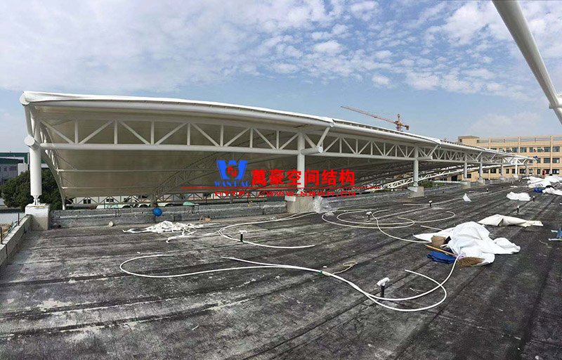 慈溪自來水廠污水池膜結構為工業設施配套工程。結構最大跨度40米,采用桁架結構外覆PVC膜材的形式,建筑面積5000㎡,用鋼量330噸,膜材用量6200㎡。項目施工難度大,實施階段考慮到實際運營的需要并保持自來水廠不受各項因素的干擾及污染(帶水作業),為該市的民生工程。