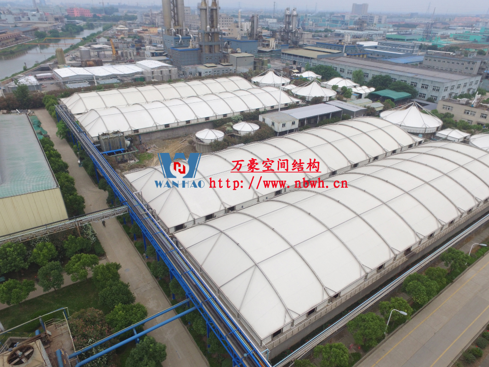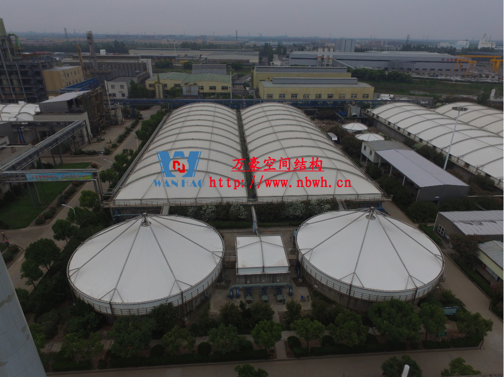 東廠區生化池膜結構加蓋工程,坐落于浙江省紹興市杭州灣上虞經濟開發區龍盛科技園內。整個項目由A/O池加蓋4座、二沉池加固定蓋4座、濃縮池加蓋2座、氧化池加蓋1座、氧化氣浮池加蓋1座、氧化集水池加蓋1座、出水調節池1座、安諾池1座,共計15座鋼膜結構組成。總用鋼量達350噸,膜結構展開面積達35000平方米。